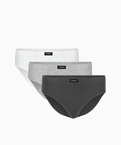 Набор из 3 шт. мужских трусов-слипов Atlantic их трёх цветов: серый меланж, графитовый, белый из базовой коллекции. Коллекция Basic - это постоянная коллекция польского бренда Atlantic, включающая в себя как мужское, так и женское нижнее белье, выполненное в базовой цветовой гамме.