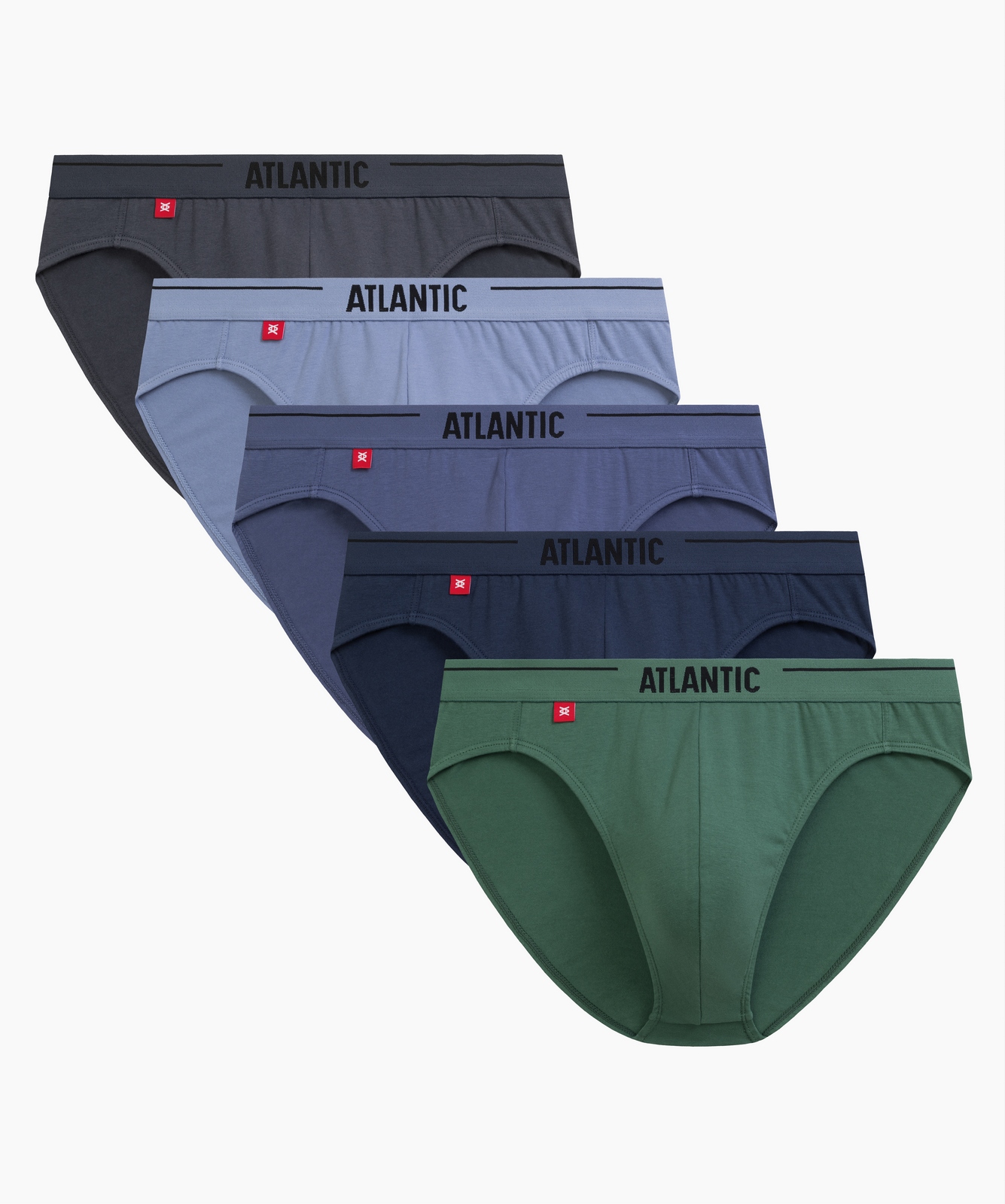Набор из 5 шт. мужских трусов-слипов Atlantic графитового, голубого, деним, индиго и темно-зеленого цвета. Мужские классические однотонные трусы-слипы 5SMP-004 от польского бренда Atlantic на каждый день: превосходно подойдут абсолютно любому мужчине как для повседневной носки, так и для активного занятия спортом (например, бега, фитнеса или физических нагрузок). Анатомический крой этой модели гарантирует идеальную посадку по фигуре и максимальный комфорт. Внешняя пришивная резинка не давит, не скручивается и не натирает при носке. Облегающие мужские трусы слипы имеют слегка заниженную линию талии и универсальную ширину по бокам, поэтому могут подойти к любому типу одежды. В составе используется мягкий, приятный на ощупь хлопок в сочетании с эластаном. В упаковке представлено пять трусов брифов в различных вариантах расцветок - от строгого классического до яркого молодежного, брендированная резинка сделана из микрофибры. Нижнее белье Атлантик будет превосходным подарком для мужчин всех возрастов.