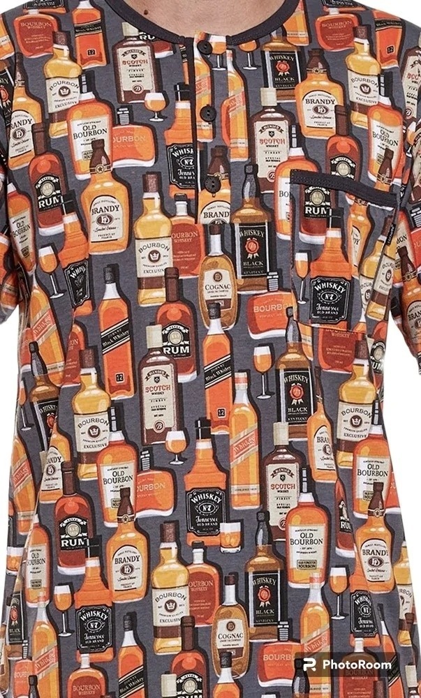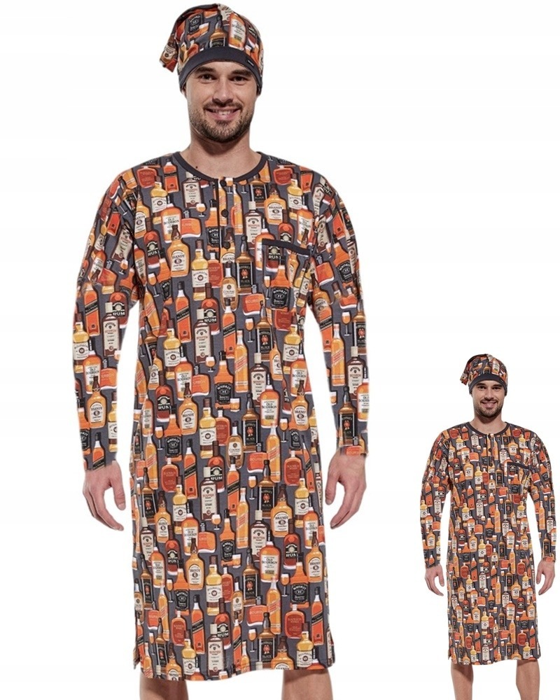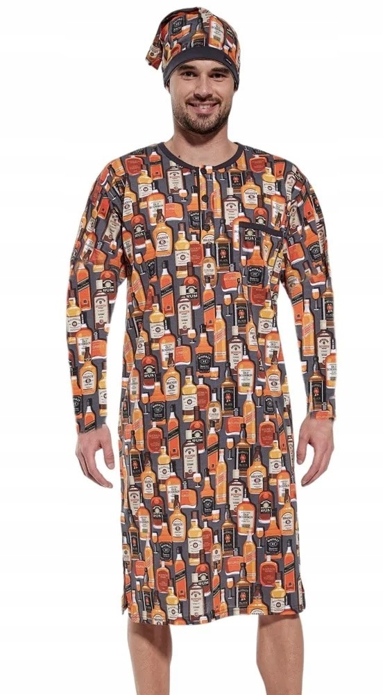 Дополнительная особенность наличие нагрудного кармана и застежки на пуговицах. Декор дерзкий принт в виде бутылок виски, по бокам разрезы. Рукава длинные. В комплекте идет ночной колпак.
