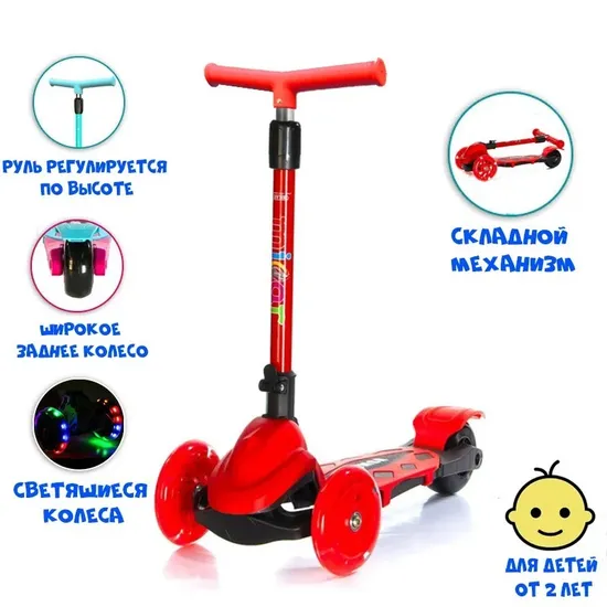 Детский складной трёхколёсный самокат со светящимися колёсами Scooter Mini Micar Zumba. Cамокат Scooter Mini Micar Zumba создан специально для малышей которые делают "первые шаги" в катании, и подходит от 2 лет. Самокат выполнен из полипропилена и алюминия, благодаря чему его вес максимально облегчен, что так важно для малыша.