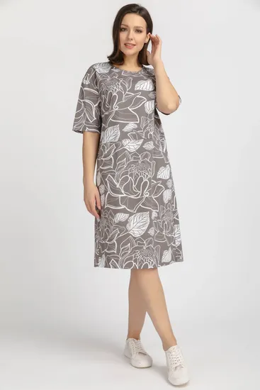 Платье прямого силуэта из хлопкового трикотажного полотна качества пенье. Круглый вырез горловины, спереди карманы. Спущенная линия плеча, рукава длинной до логтя. Длина изделия чуть ниже колена. Рост модели на фото 170см.