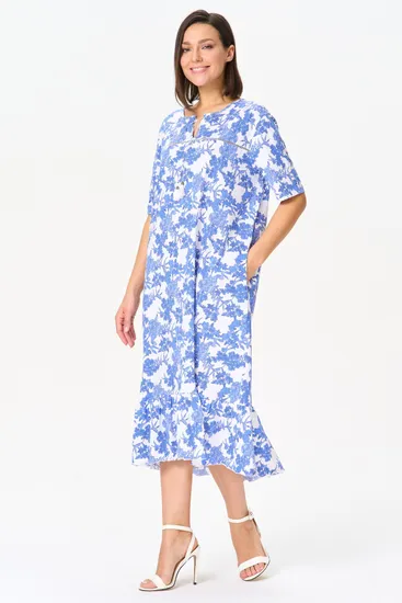 Платье расширенного силуэта из хлопкового трикотажного полотна. Круглый вырез горловины с завязками "кисточками", полочка декорирована мережкой. Втачные рукава длиной до локтя, в боковых швах карманы, фигурная линия низа. Длина изделия ниже колена. Рост модели на фото 170.
