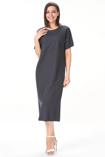 Платье расклешенного силуэта из хлопкового полотна. Вырез горловины V- образной формы. Короткий рукав. Длина ниже колена. Рост модели 177.