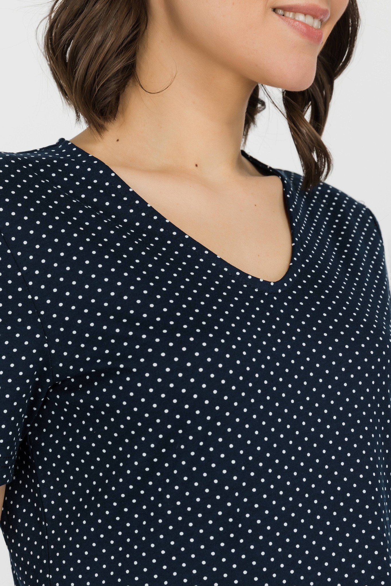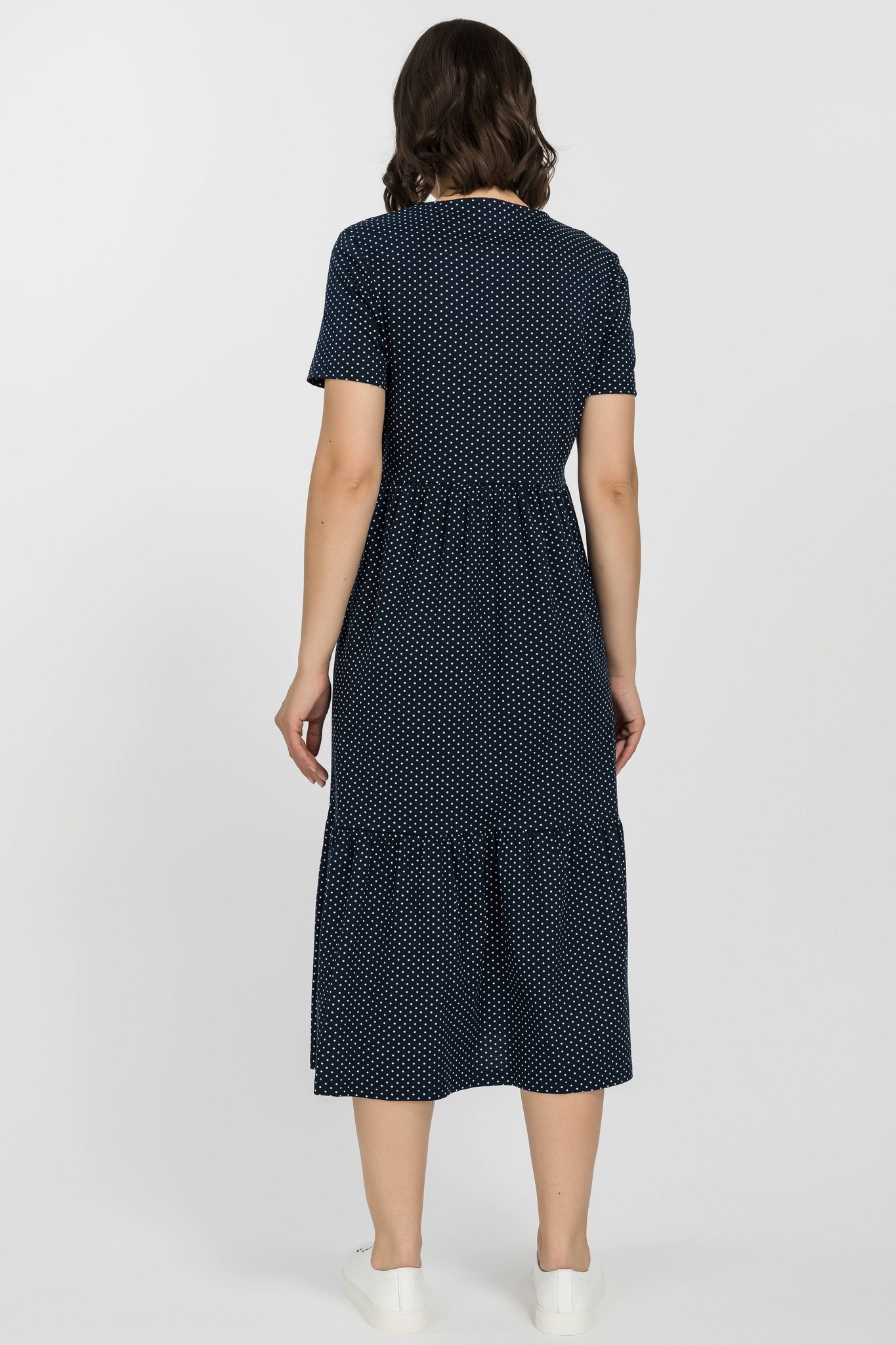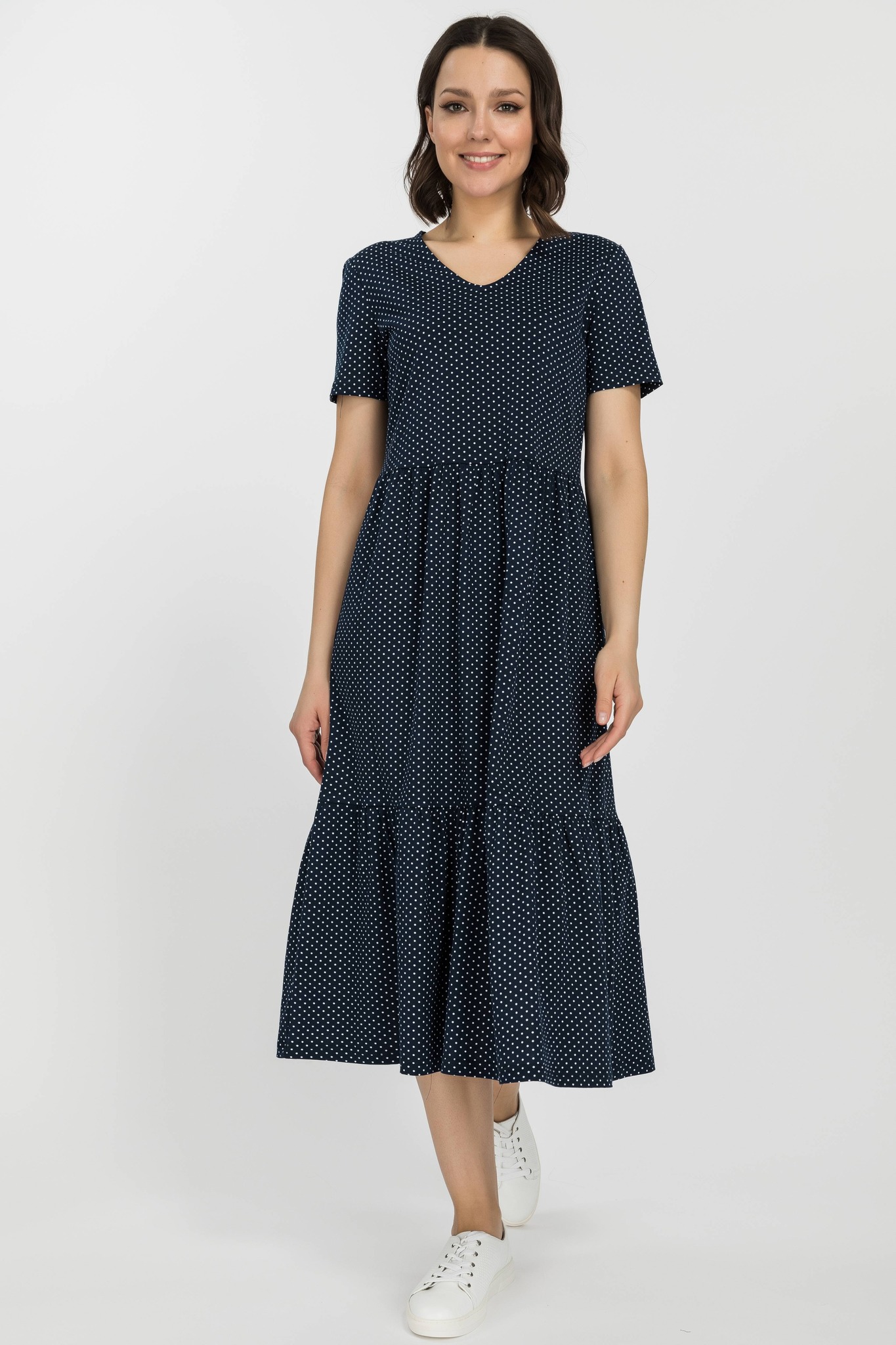 Платье расклешенного силуэта из хлопкового полотна. Вырез горловины V- образной формы. Короткий рукав. Длина ниже колена. Рост модели 170