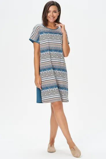 Платье прямого силуэта из сочетания хлопкового и меланжевого трикотажных полотен. Круглый вырез горловины, спущенная линия плеча, цельнокроенные короткие рукава. В боковых швах карманы и по низу разрезы. Длина изделия до колена. Рост модели на фото 170.