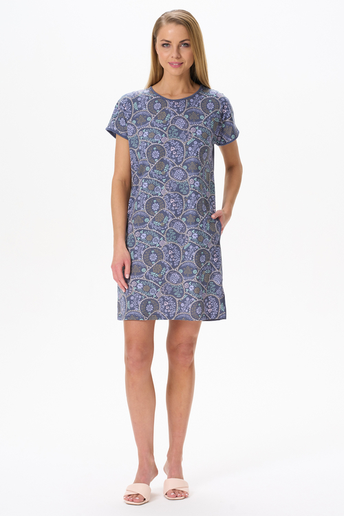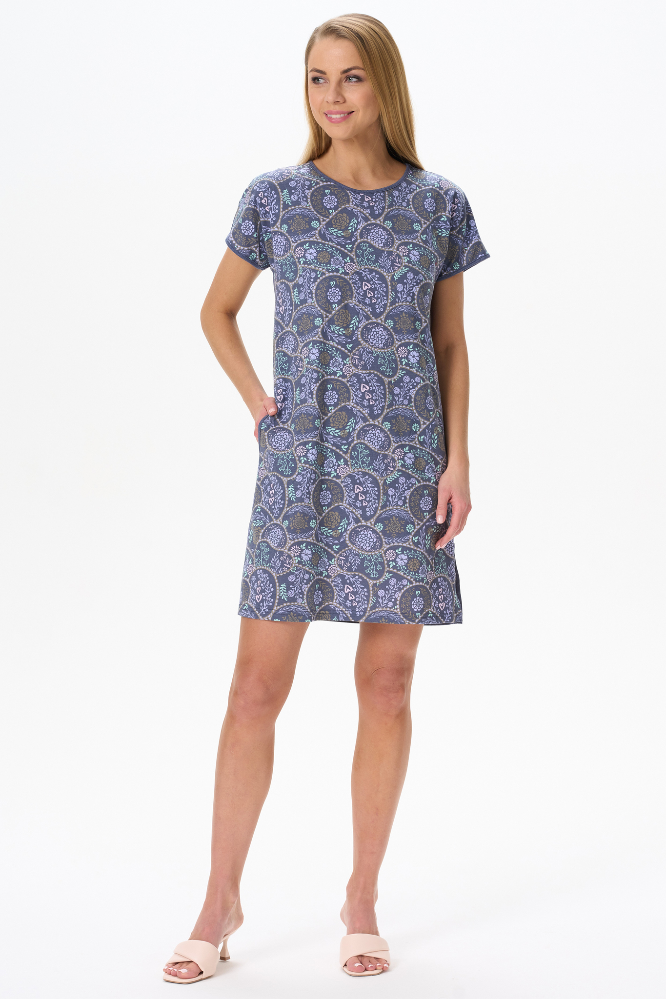 Платье прямого силуэта из сочетания хлопкового и меланжевого трикотажных полотен. Круглый вырез горловины, спущенная линия плеча, цельнокроенные короткие рукава. В боковых швах карманы и по низу разрезы. Длина изделия до колена. Рост модели на фото 170.