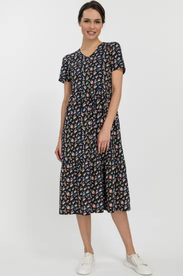 Платье расклешенного силуэта из хлопкового полотна. Вырез горловины V- образной формы. Короткий рукав. Длина ниже колена. Рост модели 177. Цвет: синий Состав: 100% хлопок
