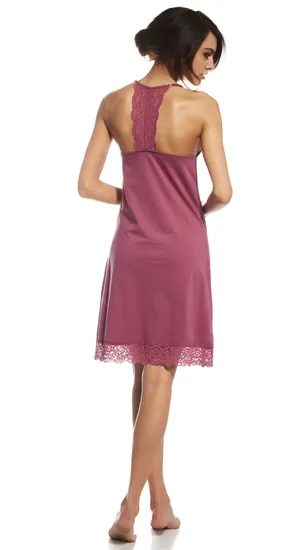 Короткая сорочка выполнена из высококачественного натурального хлопка с модалом, нежного бордового цвета. Модель полуприлегающего силуэта, на тонких регулируемых бретелях. В качестве декора - верх лифа и низ сорочки украшены тонким кружевом, по центру атласный бантик. Изюминкой модели выступает спинка, которую украшает тонкое кружево. Сорочка очень красивая и комфортная, можно использовать как одежду для дома.