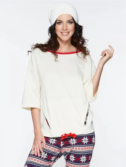 Пижама женская идеально подойдет для сна и отдыха. Футболка с рукавом 3/4 длины, длинные штаны. Рубашка однотонная с круглым вырезом с окантовкой по горловине, удобные карманы. Брюки свободные с зимним геометрическим рисунком.