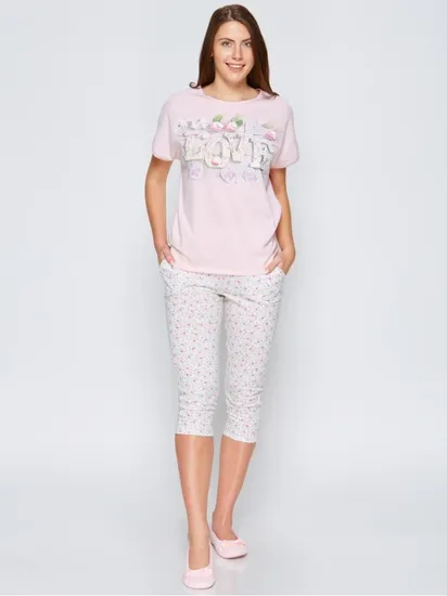 Удобная и практичная пижама состоящая из футболки с коротким рукавом и капри. Отличный вариант для сна и отдыха.