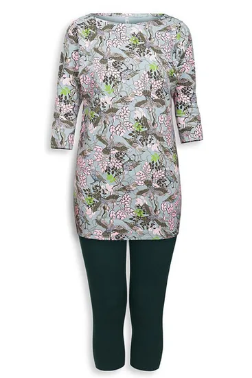 Пижама женская из трикотажного хлопка. В комплекте футболка с длинным рукавом и длинные брюки из трикотажа с красивым растительным рисунком с райскими птицами с тонкой прорисовкой в ювелирной графике