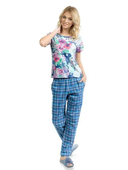 Смело и ярко! Уникальное сочетание клетки с цветочным принтом! Комплект трикотажный (футболка и брюки). Особенности: брюки с карманами, из мягкой натуральной фланели.