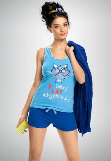 Комплект с шортиками и майкой со стразами и принтом ""Я вижу мир по-другому"". Состав: майка 93% хлопок, 7% эластан; шорты 93% хлопок, 7% эластан.