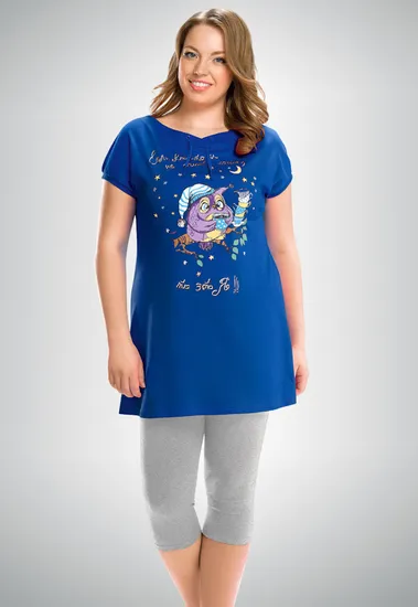 Очень комфортный комплект отлично подойдет как для уютных домашних будней так и для сладкого сна: красивая приталенная туника, с интересным вырезом горловины, в комплекте с однотонными трикотажными бриджами. Модель с красивым метализированным принтом.