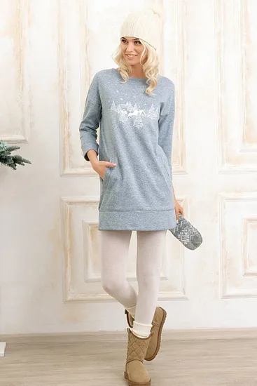 Трикотажное платье из мягкой объемной ткани отличный вариант для отдыха и дома. Модель декорирована мягким декоративным шнуром и мерцающим принтом, что придает модели праздничного настроения.