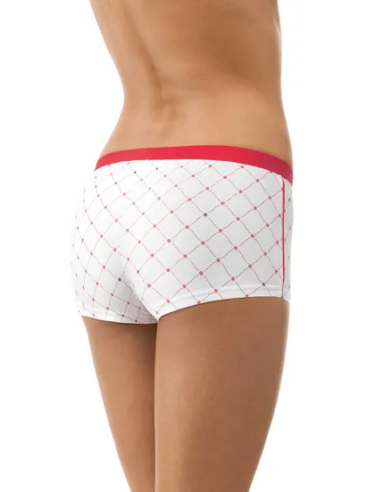 Короткие женские шорты классической посадки с комфортным поясом запакованного типа. Шорты белого цвета с раппортным принтом «Fishnet». В боковые швы вшиты узкие лампасы. Декоративная строчка по центру передней детали и две пуговицы имитируют клапан-застежку. Вся отделка выполнена в красном цвете. Модель выполнена из высококачественного трикотажа с добавлением эластана для улучшенной посадки на фигуре и снижения риска деформации при стирке.