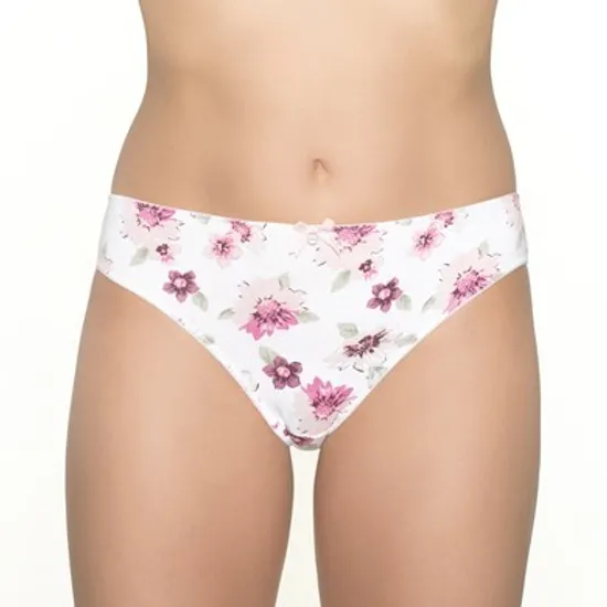 Очаровательные женские трусы бикини из натурального хлопка. Задняя часть выполнена из мягкого кружева с цветочным мотивом. В поясе удобная резинка с бантом и подвеской.